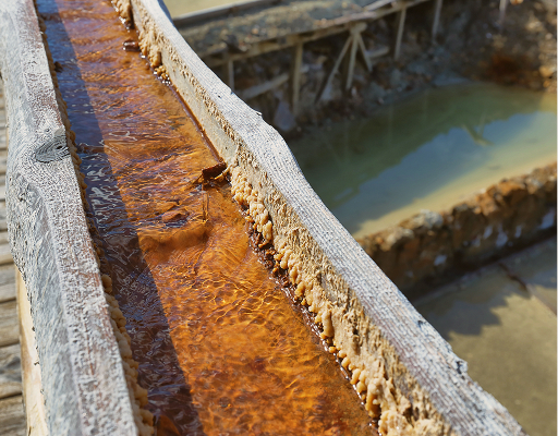 Mineral-rich spring water flows through a network of wooden channels and terraces before slowly evaporating under the sun, leaving behind delicate salt crystals.